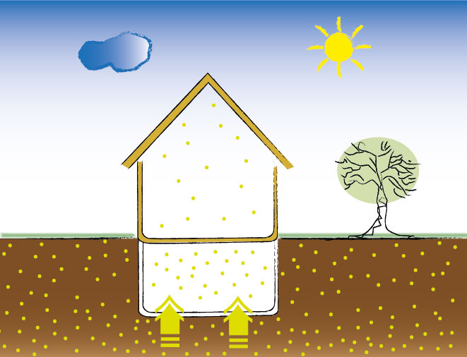 - Konvektion (Strömungstransport) von Bodenluft durch erdberührte Bauteile
